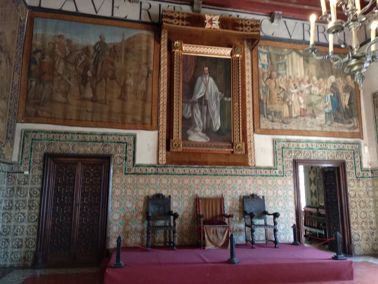 Y encontramos este panel de cerámica, en la Sala de la Cinta, donde se pueden ver los escudos de Aragón y de Sicilia. Era una sala importante, donde se recibía a personajes ilustres.