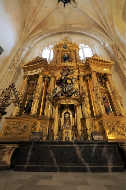 Exterior de la Capilla de los Condestables. Y una curiosidad, que a mí me gustan mucho: cuando leí lo de la cripta de esta capilla, explicaban el sistema que se instaló para que no sufriera deterioros. Por otra parte, debido al desnivel del terreno, el enterramiento no quedaría bajo tierra, sino a nivel de la calle. Bueno, pues debajo del relieve del sol, sobre el friso, puede verse una ventana aspillera que es la responsable de la tenue luz de la estancia y de su ventilación. Evidentemente, no está la cripta ahí mismo, ya que hay una distancia de dos o tres metros hasta la fachada.